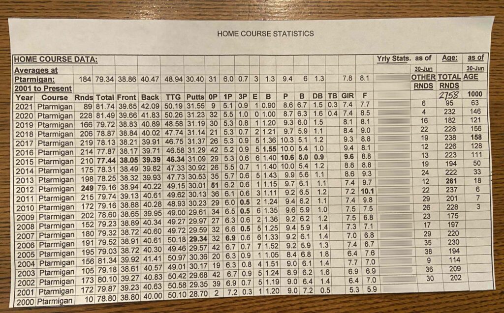 How does he know this in such detail? Because he’s kept meticulous records that he updates after each round he plays. In addition to recording his scores, he notes numerous statistical details about each round.