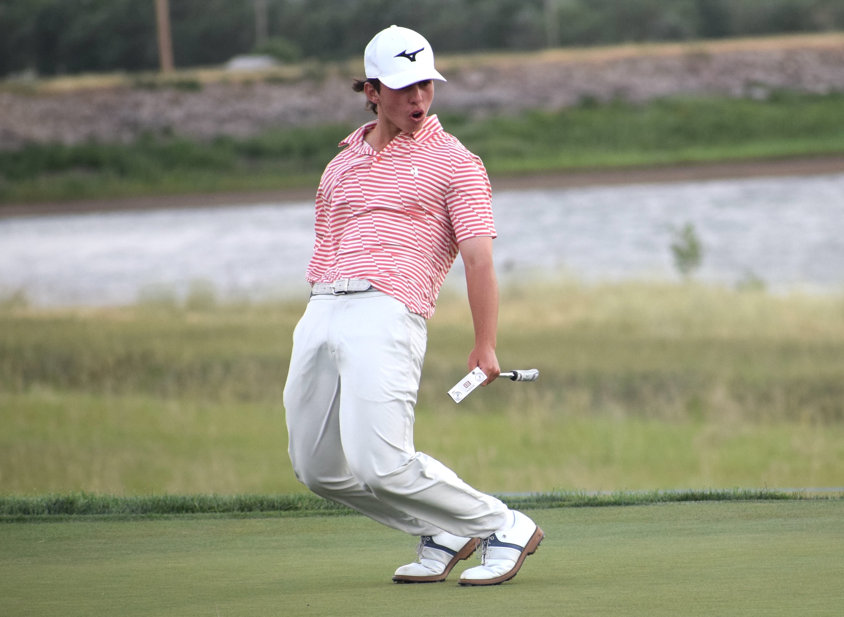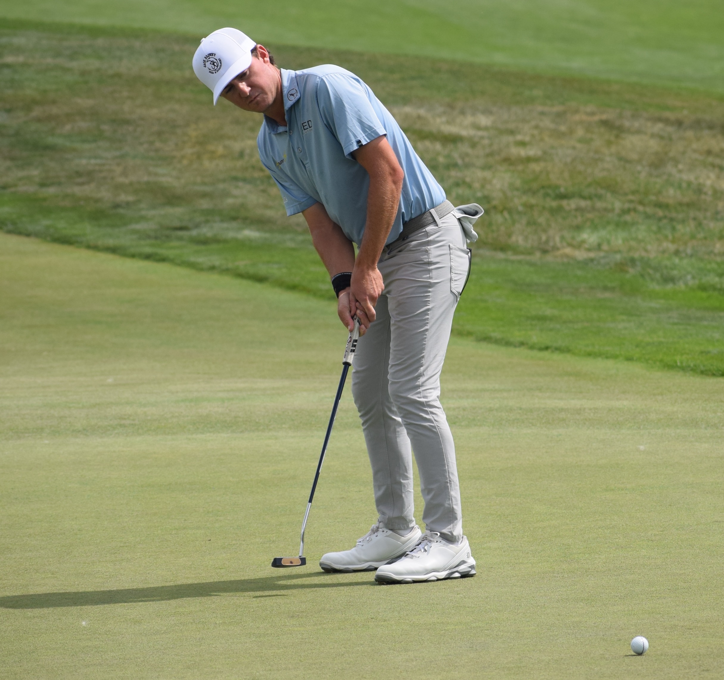17-year-old amateur Brayden Forte, who shot 77 on Thursday, tries to coax in a putt.