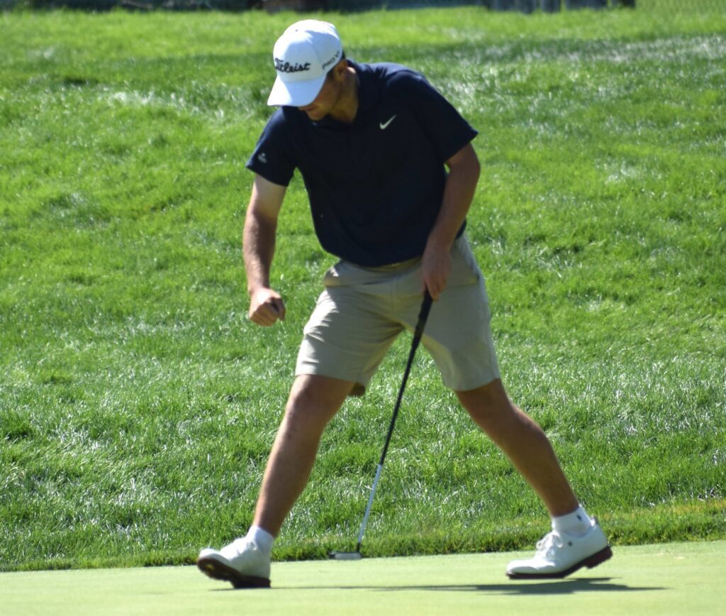 Alas, that’s when Dunlap regained his form and he birdied his next three holes — 14 (20 feet), 15 (15 feet) and 16 (6 feet) to close things out in a hurry. Dunlap’s up-and-down-and-up match added up to him being 4 under par for 16 holes.