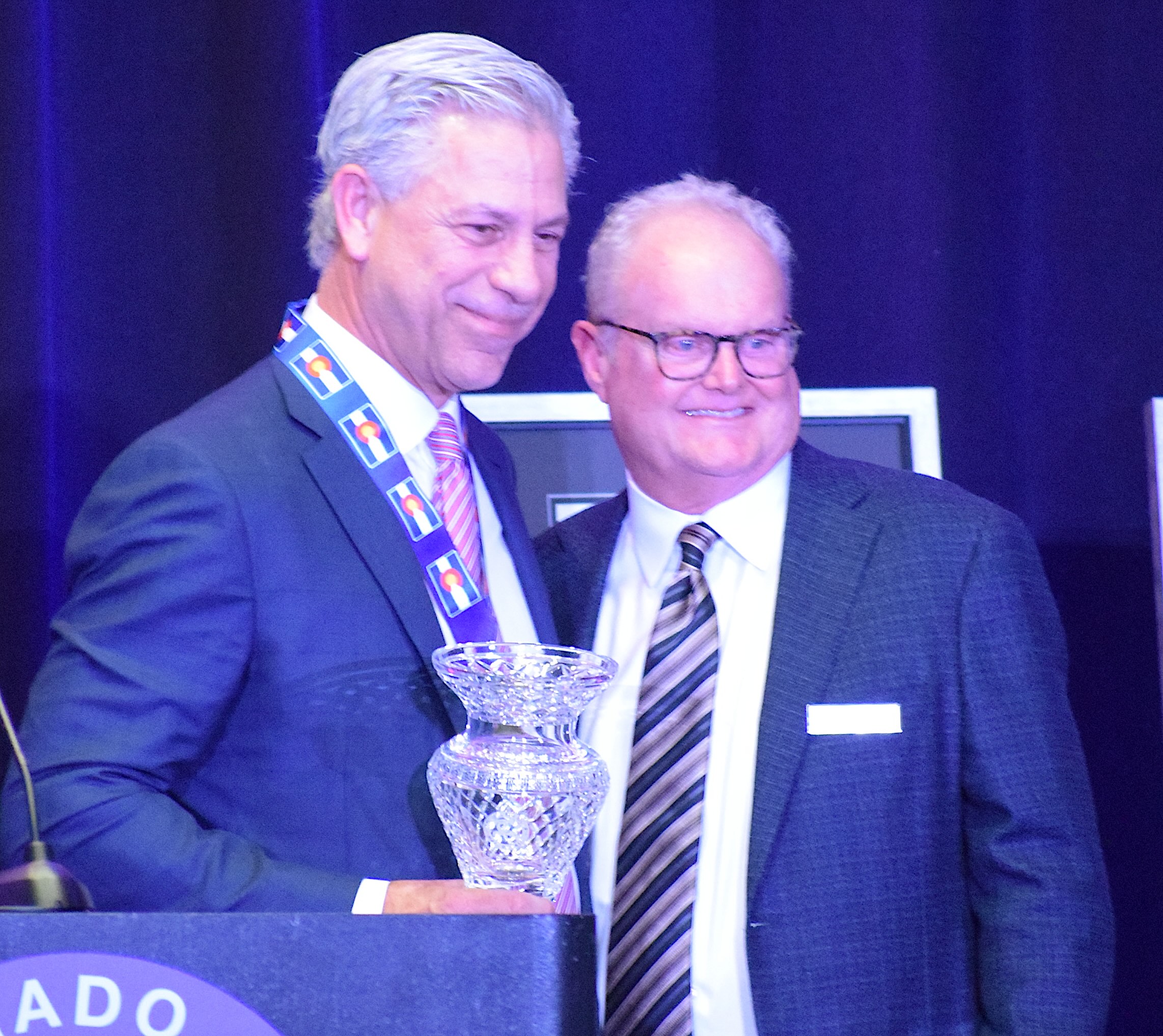 Solich with CGHOF president Bob Webster. Both are CU Evans Scholar alums.