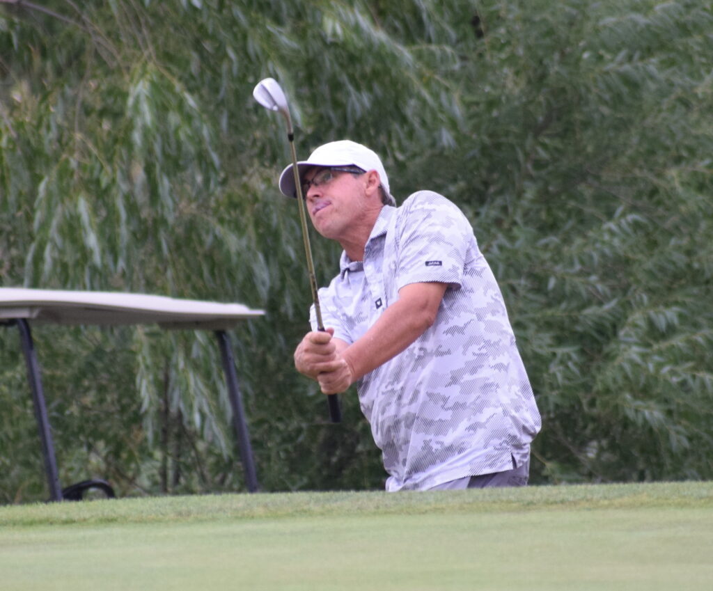 Former CU golfer Bob Kalinowski pitches to the ninth green on Friday.