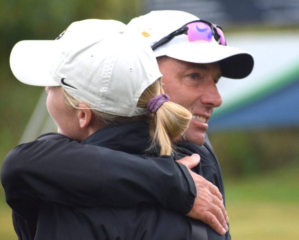 Schalk hugs daughter Hailey after the CU golfer caddied all week for him at GVR.