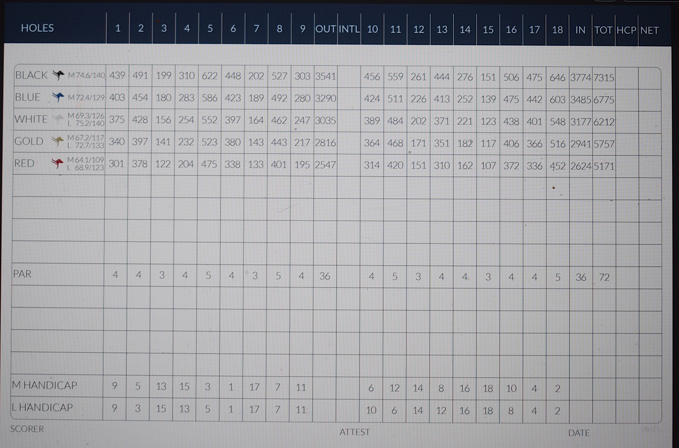 The course includes four par-3s, 10 par-4s and four par-5s. From the back tees, par-5s range from 527 to 646 yards, the par-4s from 276 to 506 yards, and the par-3s from 151 to 261 yards. The layout features three short par-4s — 276, 303 and 310 yards. From the back tees, the course rating is 74.6 and the slope is 140.