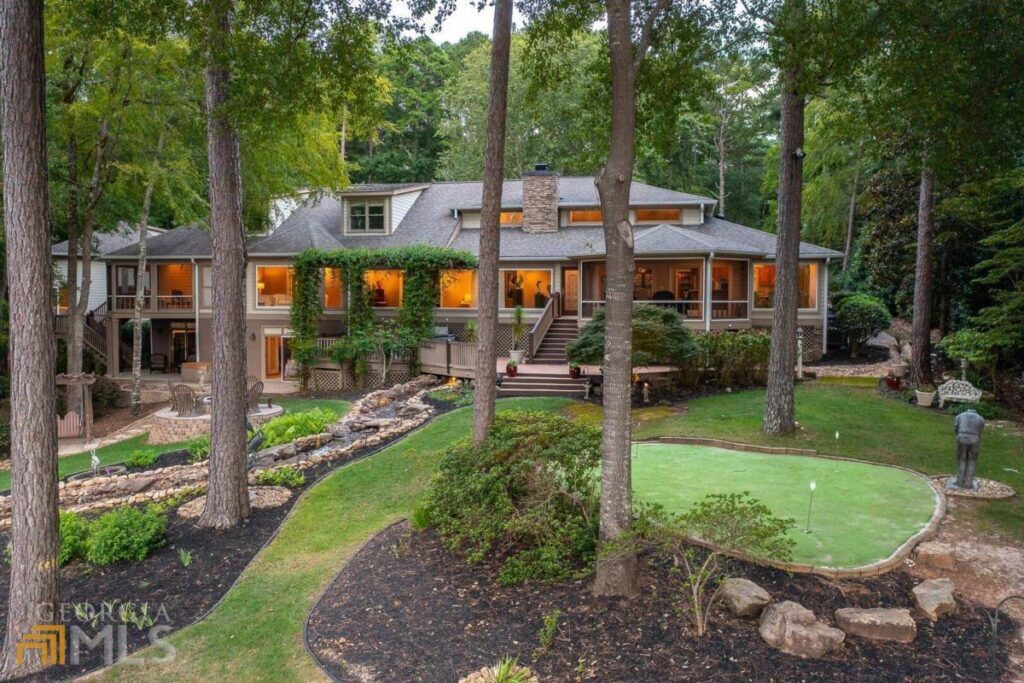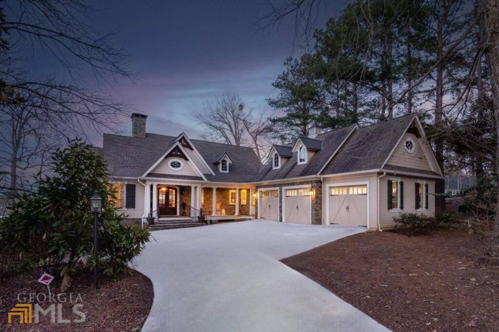 This beautiful brick, stone, and cedar shingle 8,000 sq ft house has five bedrooms, 6 full baths, two half baths, 200 ft of lake frontage, max dock and breathtaking, big water views of Lake Oconee.