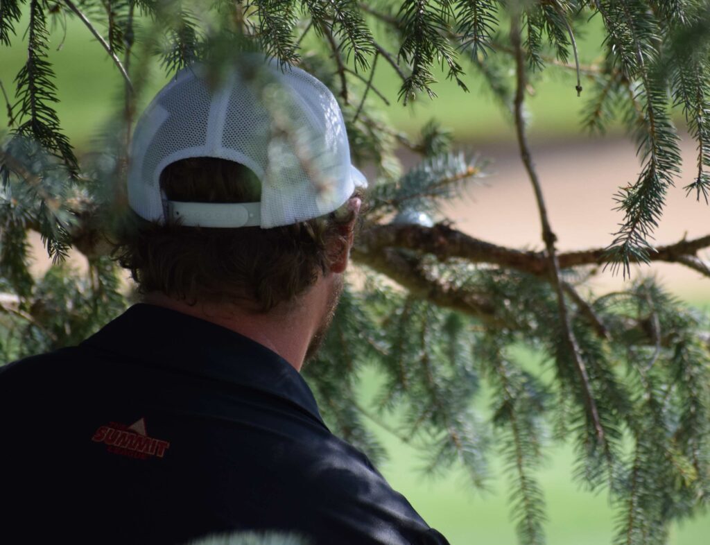After both players got up and down for par on the first extra hole (No. 10), Solem pulled his 2-iron tee shot slightly on the par-4 18th at FCCC, and his ball bounced into a pine tree — and stayed there. A rules official was there to give Solem the bad news — the ball was lodged on a branch — as he walked up to the tree.