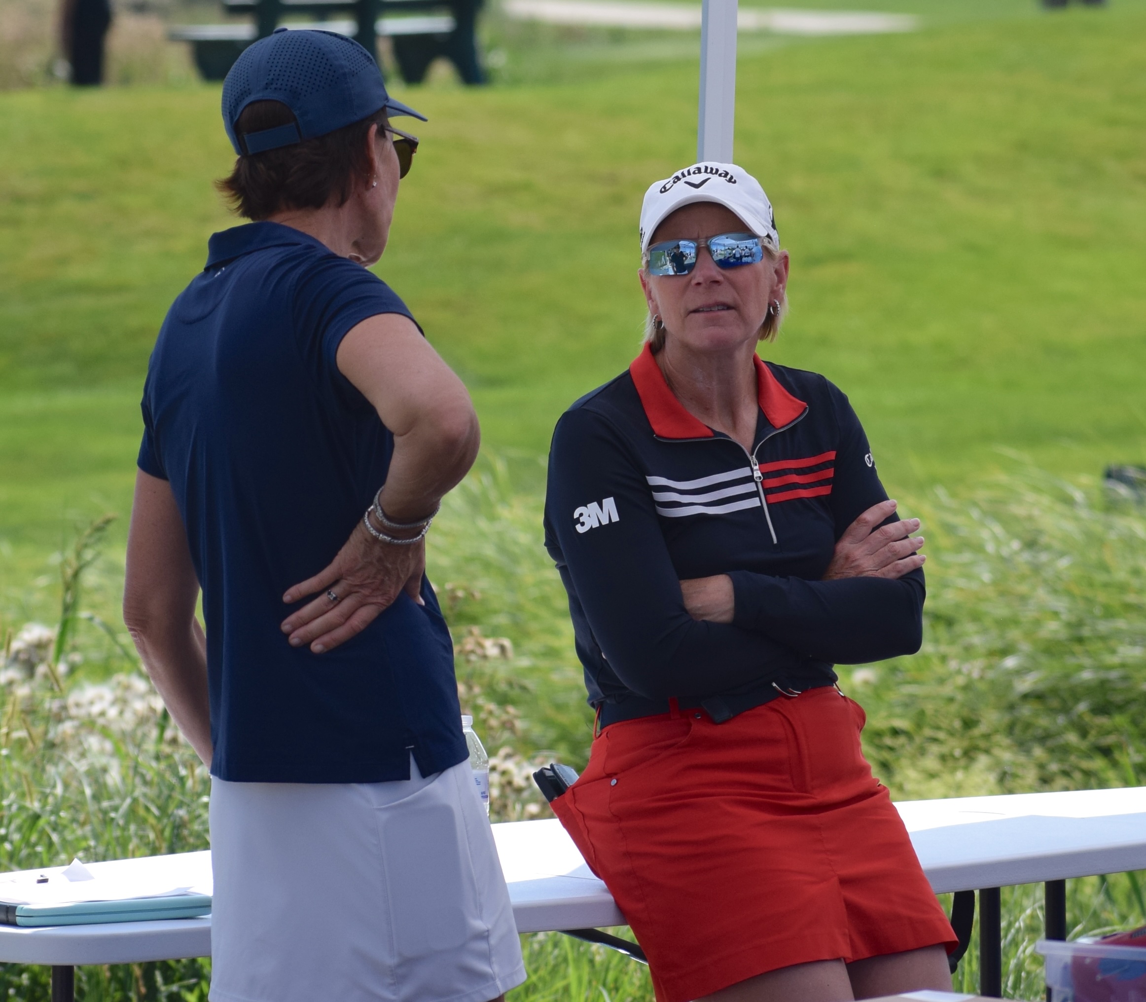 Former PGA of America president Suzy Whaley chats with Sorenstam before Monday’s clinic.