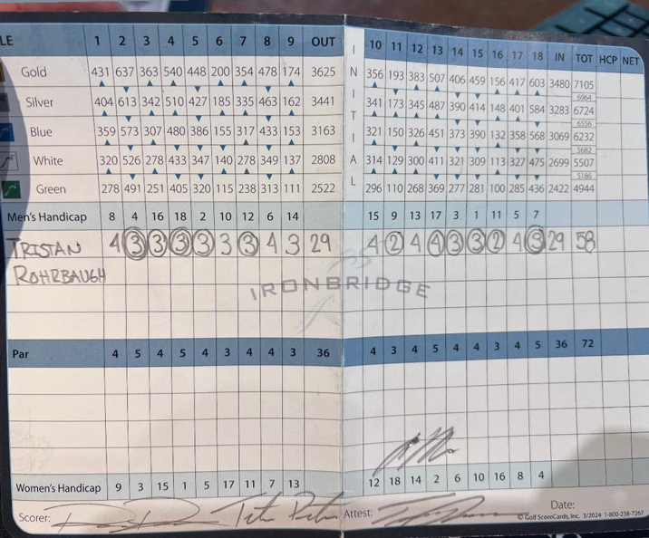 Rohrbaugh said the group played Ironbridge as long as possible — regardless of where the back tees were placed. The course’s scorecard lists the gold tee yardage at 7,105 yards for the par-72 layout.