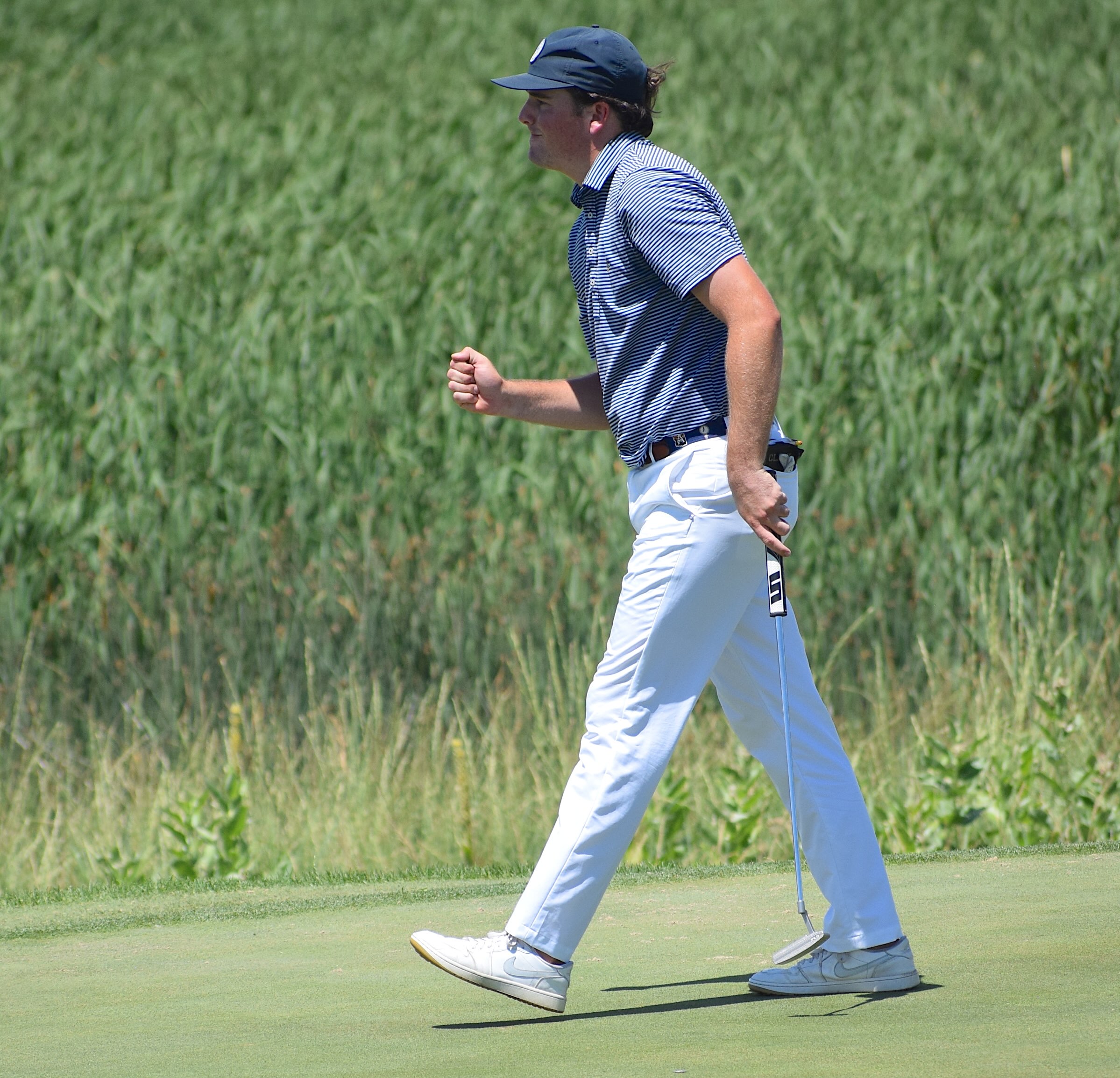 Ex-CU golfer Tucker Clark fist pumps after closing with a birdie to shoot 63.