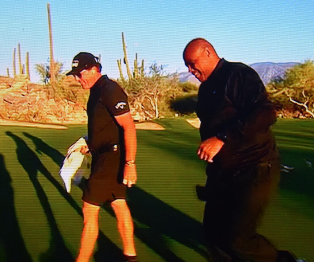 “What I’m watching is you turning water into wine,” TNT guest Deion Sanders said to Mickelson at one point.