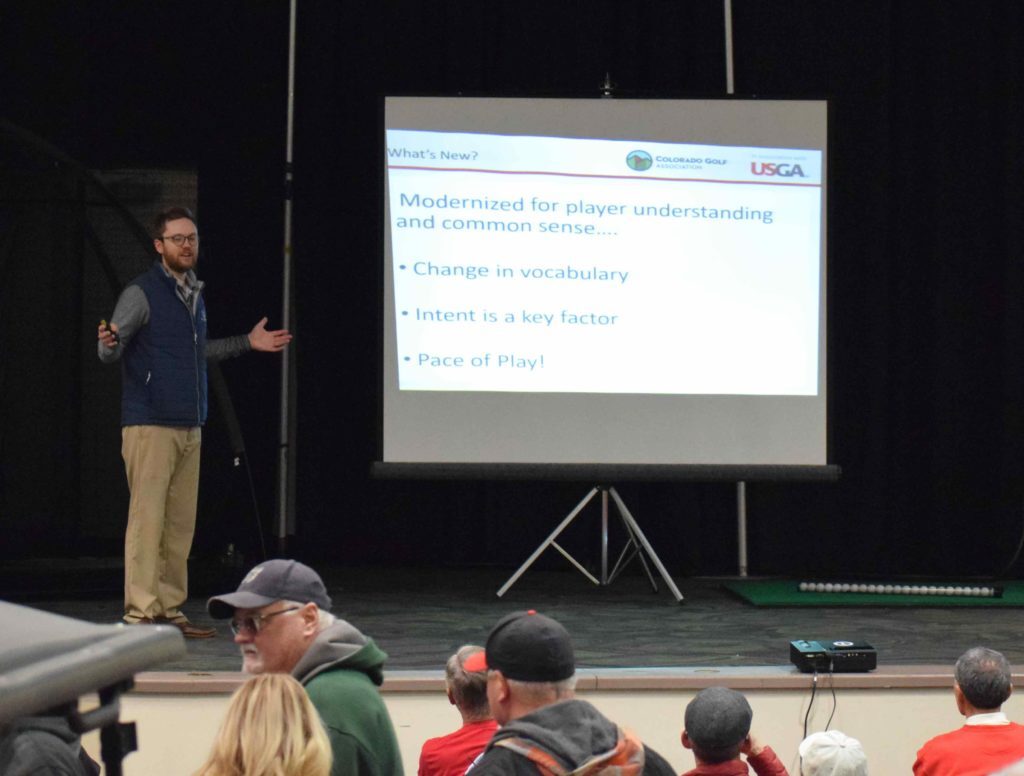 This year’s show, as usual, had plenty of deals on golf products, rounds, travel, etc., in addition to informational booths like the CGA and the Colorado Golf Hall of Fame. People could test out clubs at an indoor practice range, and compete in several contests (putting, long drive, closest to the pin, as well as drawings). There were a variety of seminars being conducted both on the main stage and in meeting rooms, and Colorado PGA professionals were conducting free 10-minute lessons throughout. There was even live music late in the day at “The Turn Lounge”.